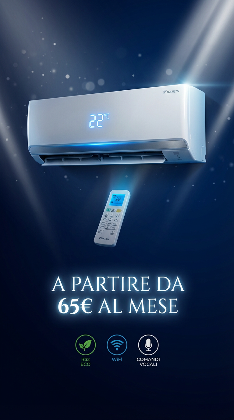 Climatizzatori Wifi con Intelligenza artificiale, gas ecologico R32, controllo Qualità dell' aria. Li puoi comandare sia a voce che a distanza con il cellulare. Potenze per ambienti da 10 a 100 mq.
