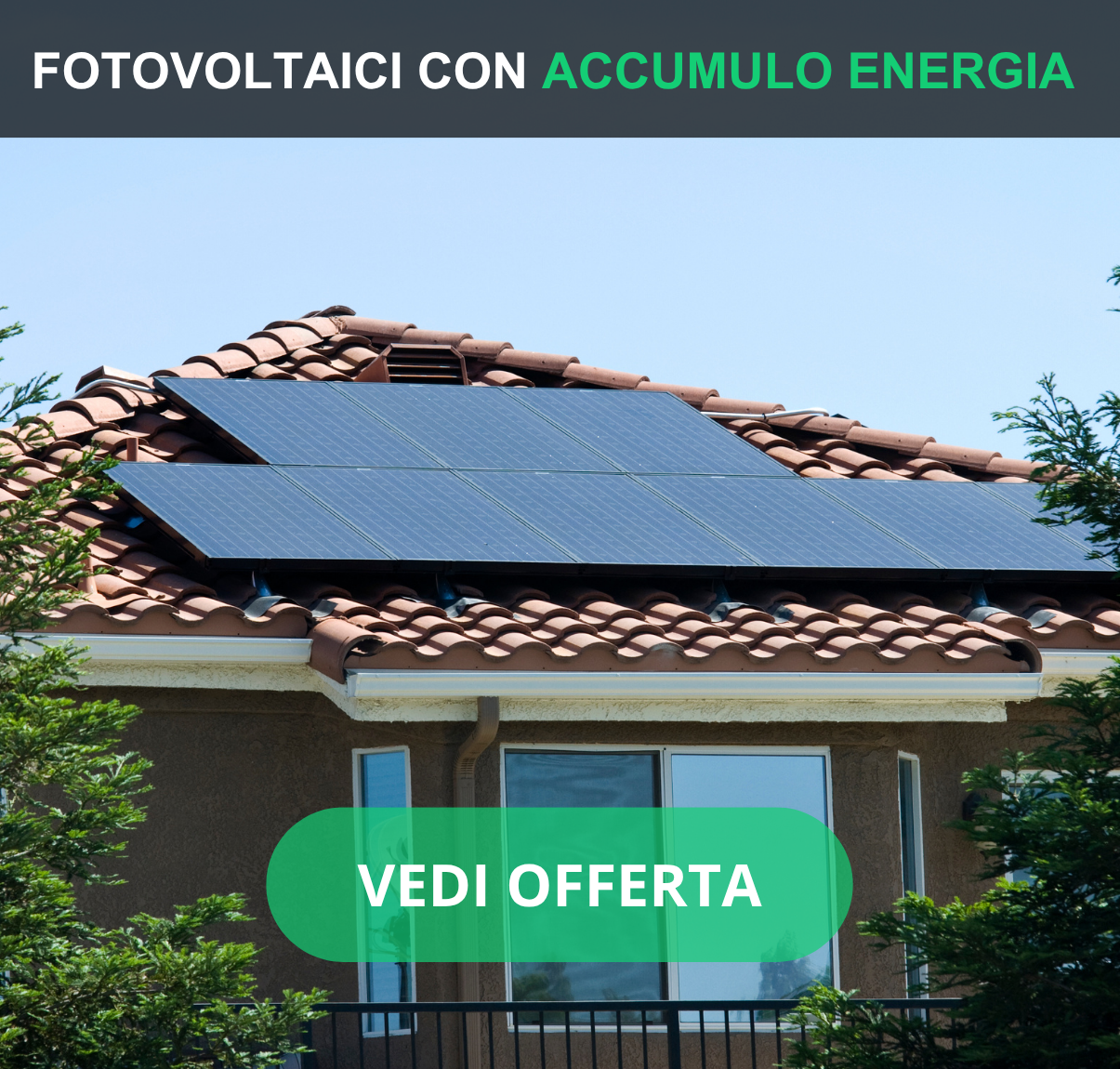 ti proponiamo le migliori soluzioni con Pannelli Fotovoltaici monocristallini da 440 a 550 W, tecnologia 108 celle, per potenze da 3/5/6/8/10/15 Kwp con batterie di accumulo incluse da 5/10/15 Kw per garantire l' azzeramento della bolletta anche di notte, per rendere più efficiente energeticamente la tua casa e aumentare il suo valore energetico e immobiliare.