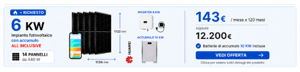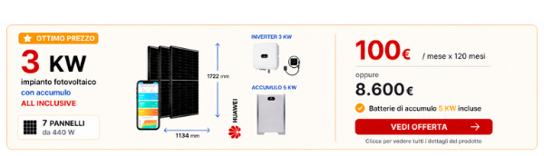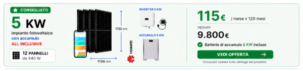 ti proponiamo le migliori soluzioni con Pannelli Fotovoltaici monocristallini da 440 a 550 W, tecnologia 108 celle, per potenze da 3/5/6/8/10/15 Kwp con batterie di accumulo incluse da 5/10/15 Kw per garantire l' azzeramento della bolletta anche di notte, per rendere più efficiente energeticamente la tua casa e aumentare il suo valore energetico e immobiliare.
